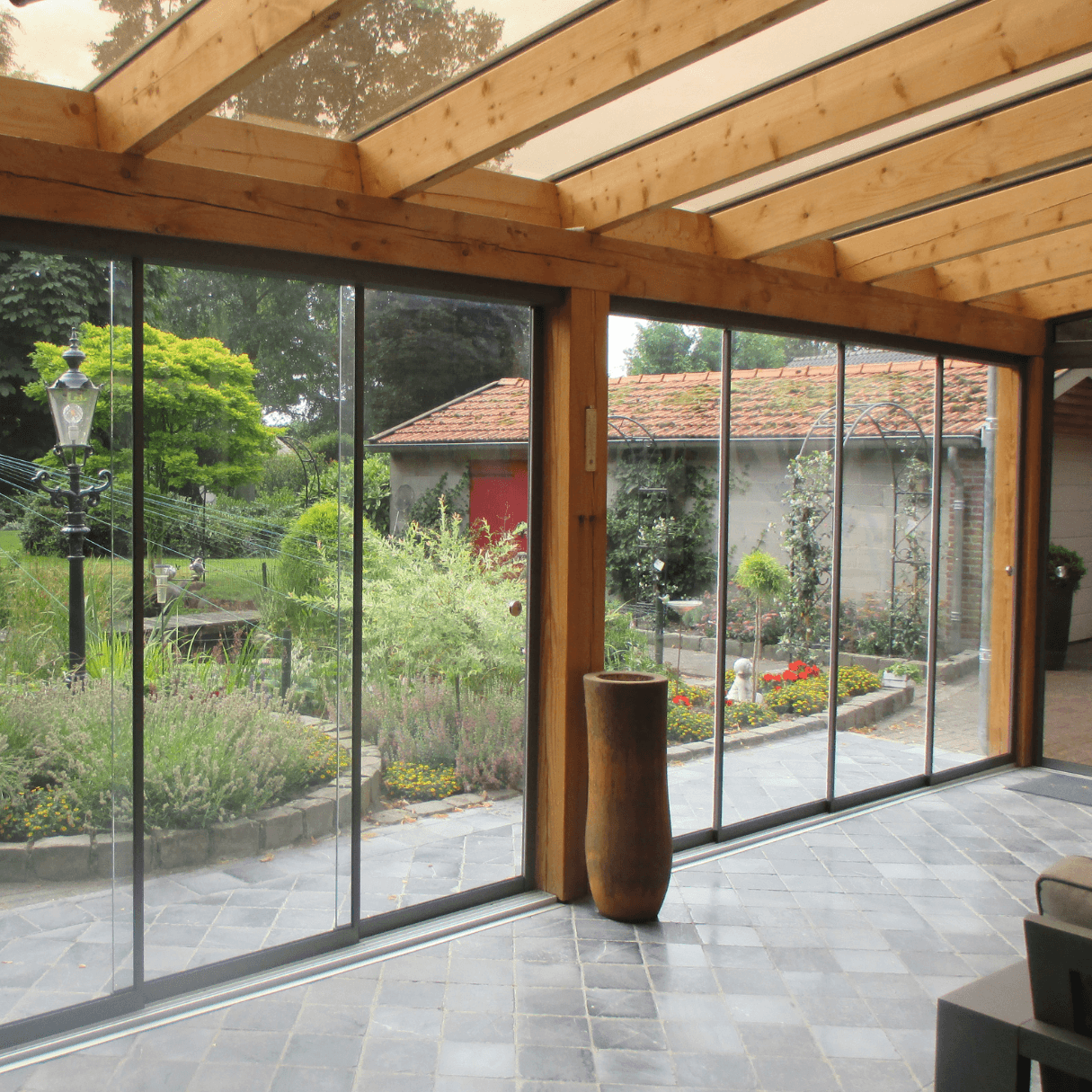 Dankzij vaste wanden en glazen schuifpanelen ben je beschermd tegen wind regen en kou terwijl je toch volop profiteert van daglicht en het buitengevoel. Of het nu lente zomer herfst of winter is in een tuinkamer zit je altijd goed. Kies voor kwaliteit en comfort en maak van je tuin een plek waar elk seizoen begint met ontspanning.